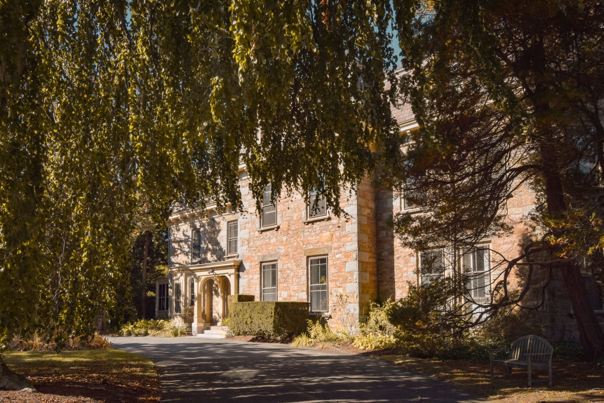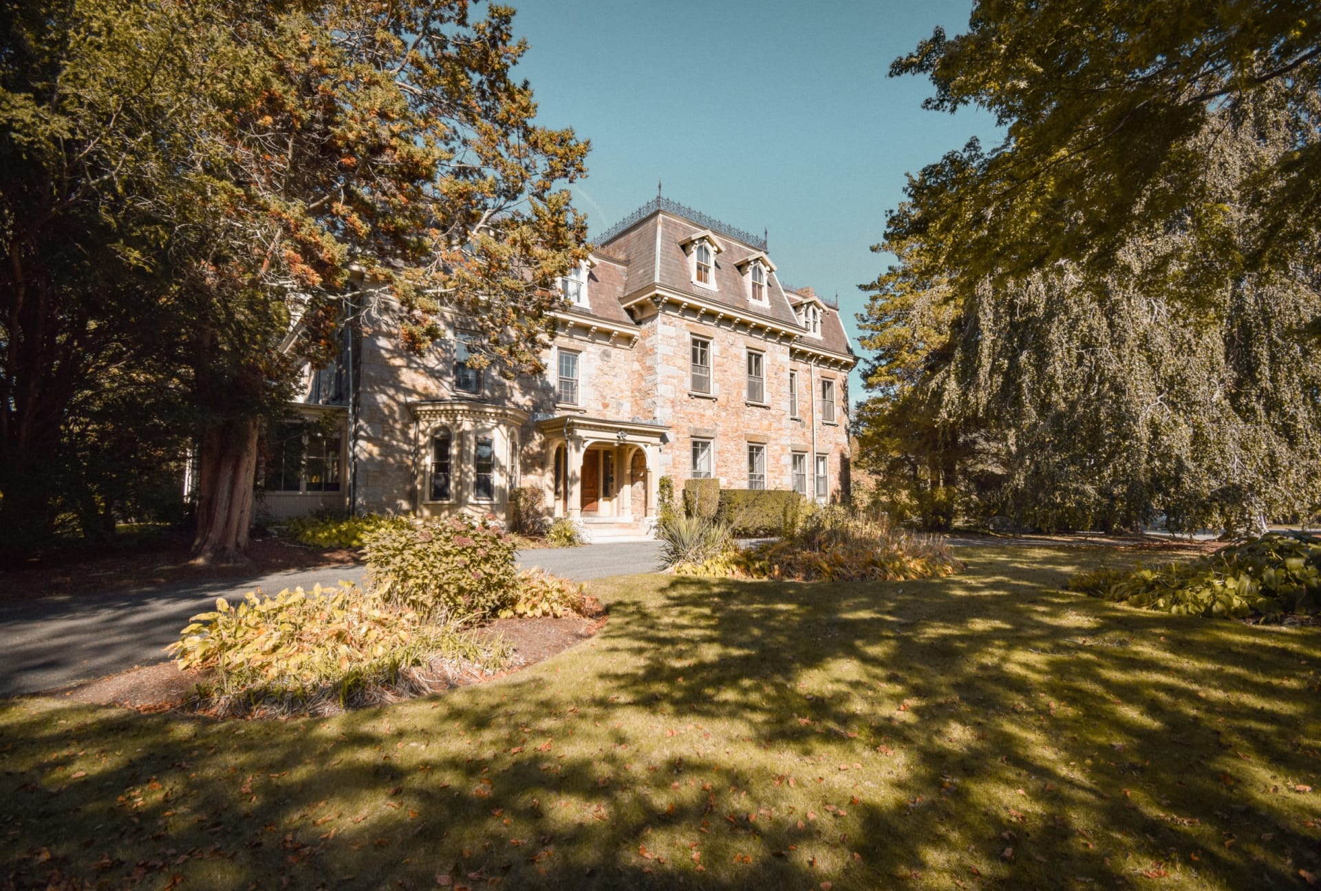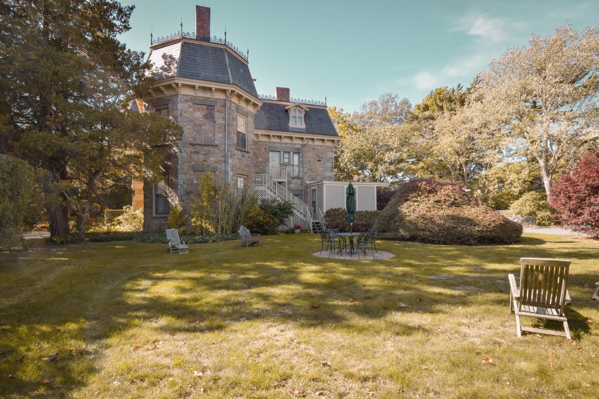 Lansmere, one of the finest examples of pre-Civil War stone architecture in Newport was built in 1852 for a Harvard Divinity School professor. Tucked away off the famed Bellevue Ave, Lansmere is located among private mansions and Preservation Society estates. The property is defined by an impressive stone wall and is surrounded by mature trees including 150-year-old beech, oak, and horse chestnut trees. Lansmere’s well-appointed and park-like grounds transport you away from the bustle of Bellevue and downtown Newport.